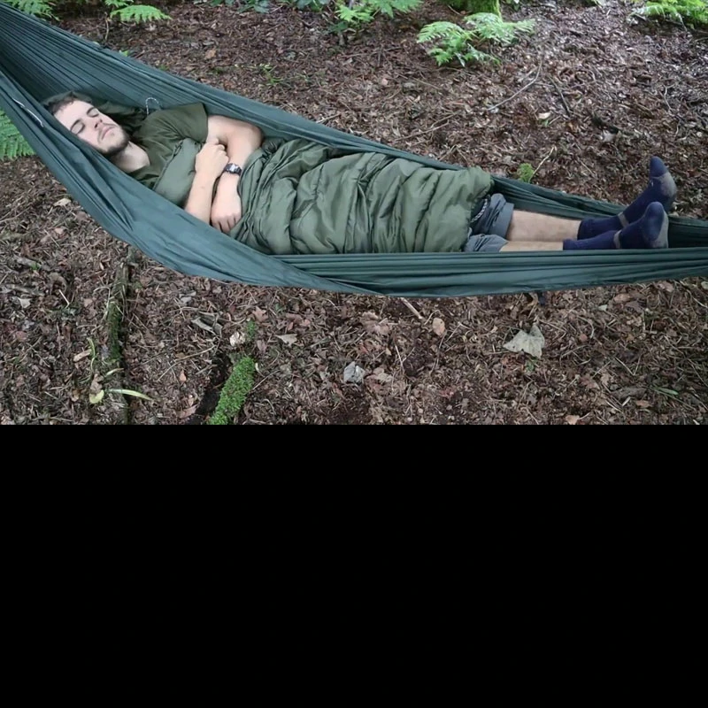 The Hammock Quilt features a three-quarter length opening on the underside, to allow for easy entry and exit when sleeping in a hammock, with an integrated hood and foot covering.