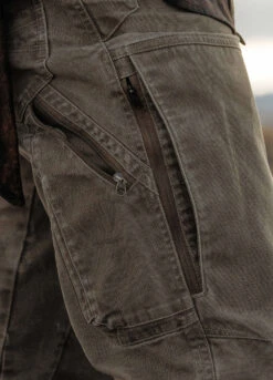 - Reinforced wax fabric below wearer’s right front hand pocket and below stealth cell phone pocket