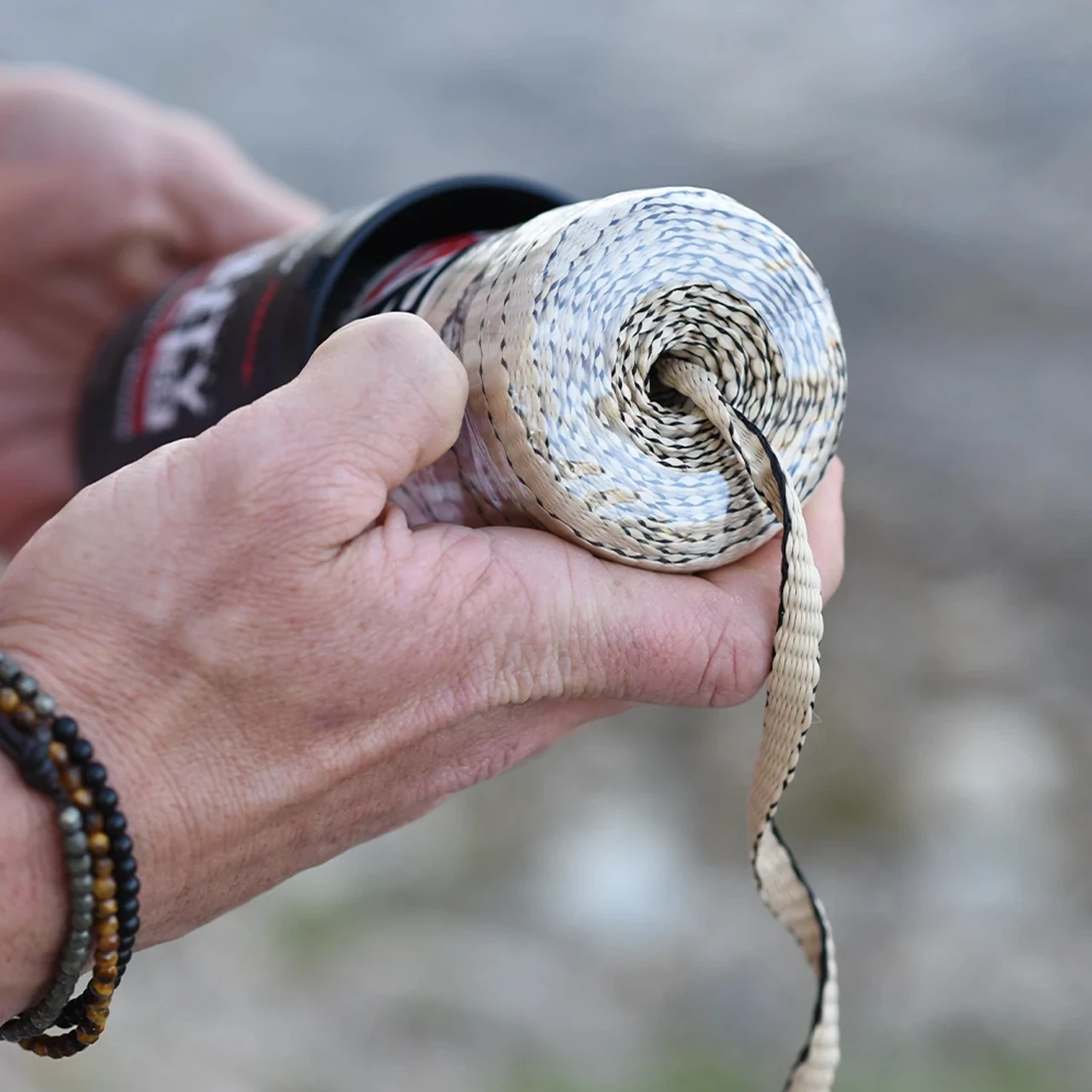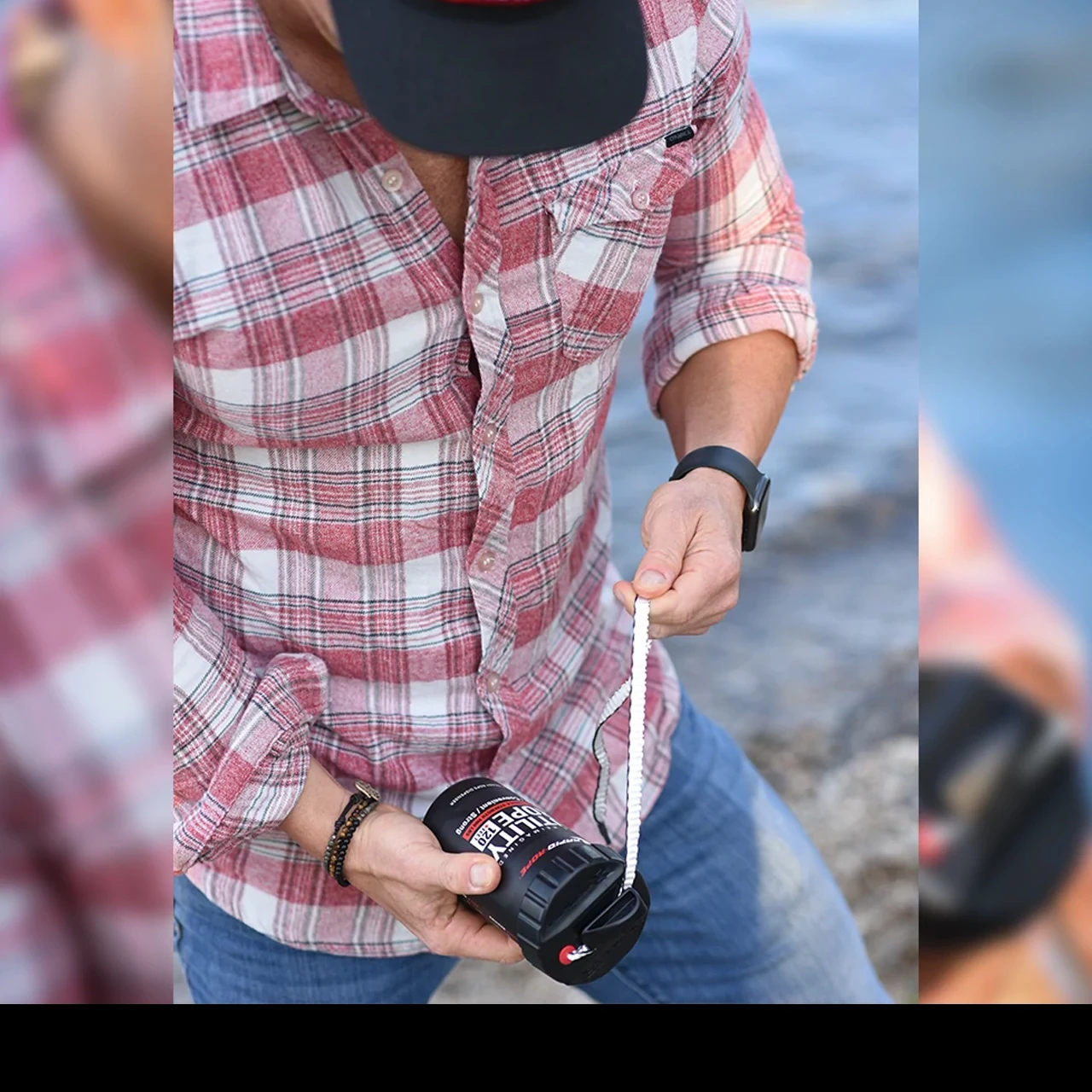 The canister is just a little larger than a 330mL can of pop and features an integrated cutter. This means the canister easily fits in your hand, pack, even your drink holder. What we like best the cord deploys from the canister in any direction (even upside down) and if you drop the canister, it doesn’t unspool leaving you tangled in a mess. You can actually deploy cord and cut it using just one hand.