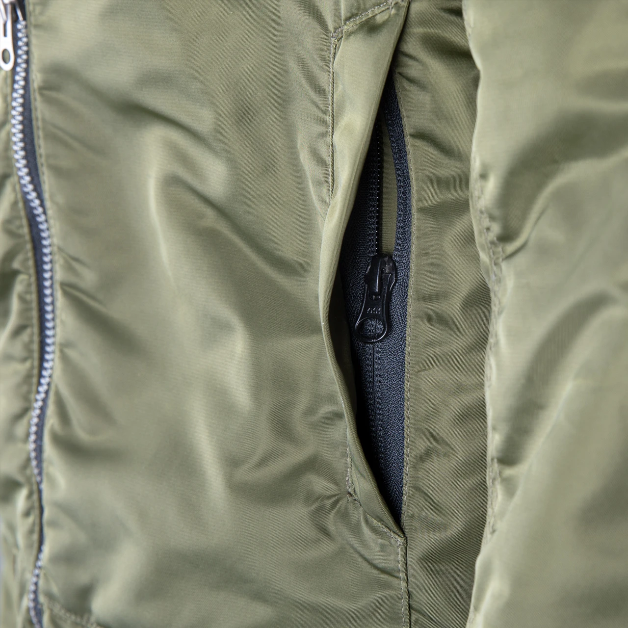 The TAD MA-1 Flight Jacket Vintage Edition features a satin twill weave exterior shell that matches the satin found in traditional MA-1Bomber Jackets.
