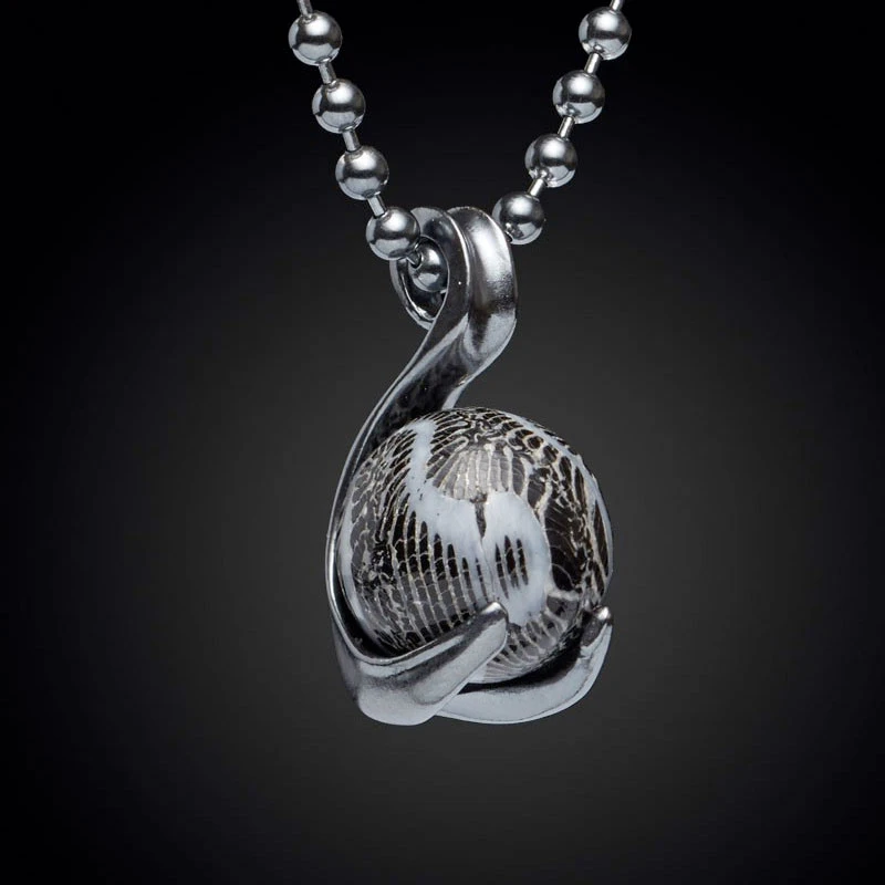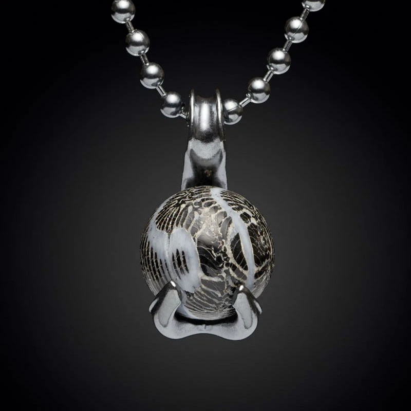 Bold elegance defines this neck piece from William Henry. A beautiful swan motif in dark sterling silver captures a gorgeous custom bead, which is securely held yet has full range of motion to play with orientation. The bead is crafted from 100,000 year-old fossil coral from the Florida Keys, a remarkable hallmark of a bygone era. Finished with a dark sterling silver ball chain.